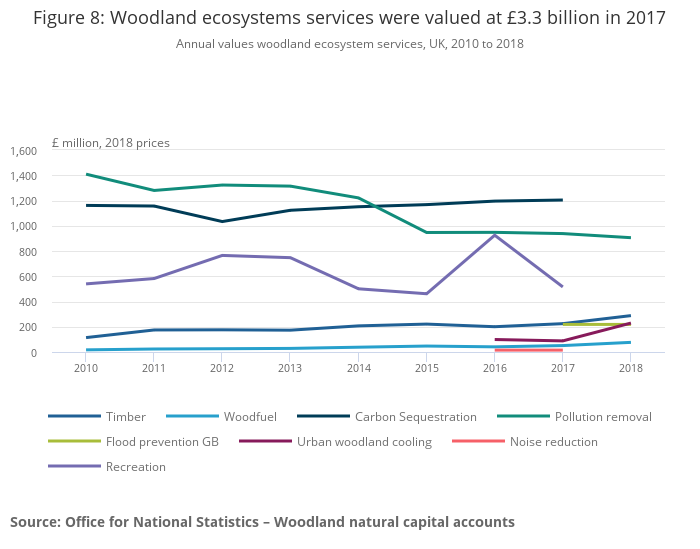 The non-market benefits of woodland exceed the market benefits of timber by approximately 12 times; timber represents £275.4 million out of £3.3 billion total annual value of woodland in 2017.
