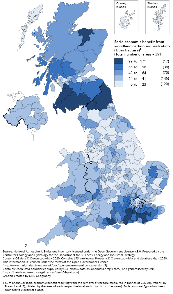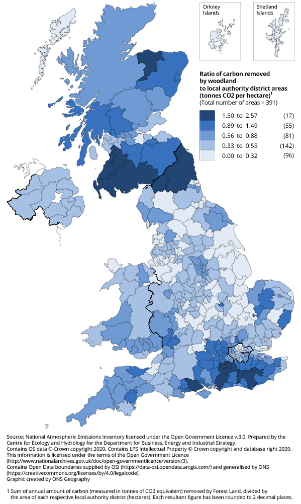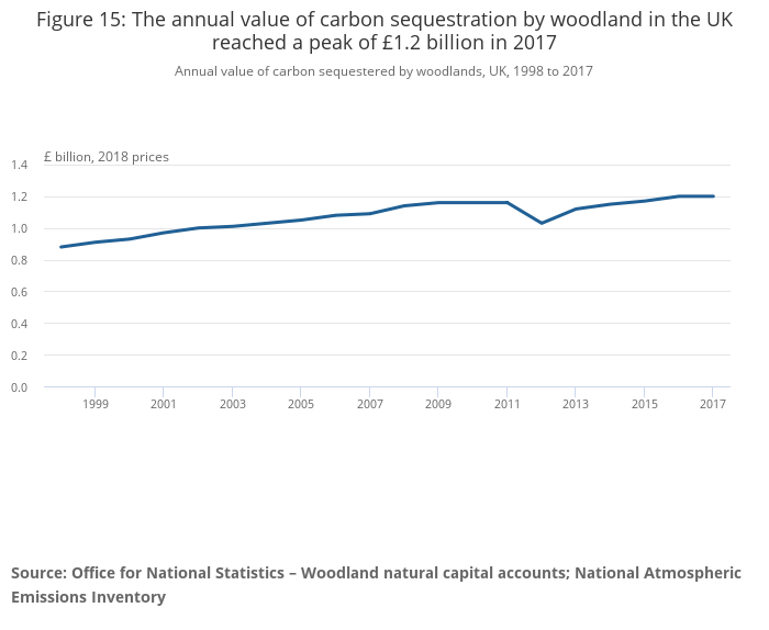 Woodland in the UK removed 18.1 million tonnes of carbon dioxide equivalent in 2017, equating to a value of £1.2 billion; this is equivalent to 4% of total UK greenhouse gas emissions in 2017.1