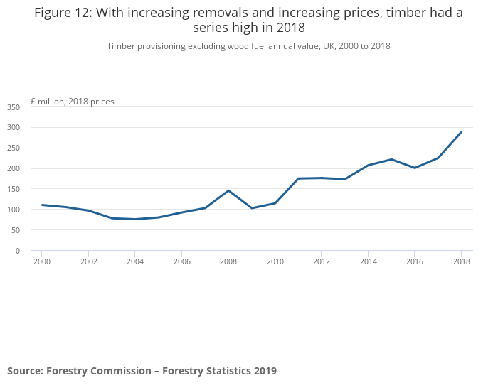 The asset value of UK woodlands was estimated as £129.7 billion in 2017, with timber representing £8.9 billion (6.9%).