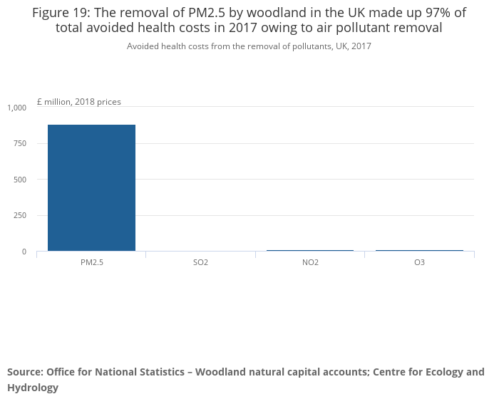 The removal of air pollution by woodland in the UK equated to a saving of £938.0 million in health costs in 2017.