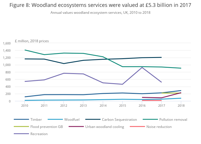The non-market benefits of woodland exceed the market benefits of timber by approximately 18 times; timber represents £275.4 million out of £5.3 billion total annual value of woodland in 2017.
