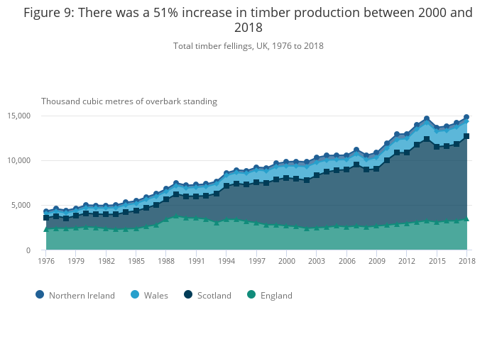 .png (232.0 kB)Land covered by forestry (Figures 1 and 2) has increased steadily by 4.4% from 3.05 million hectares in 2009 to 3.19 million hectares in 2019. Scotland has 46% of the UK’s woodlands, England has 41%, Wales has 10% and Northern Ireland has 4%. As a percentage of the total land area, woodlands account for: