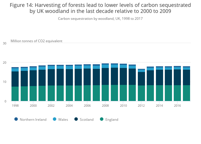 Woodland in the UK removed 18.1 million tonnes of carbon dioxide equivalent in 2017, equating to a value of £1.2 billion; this is equivalent to 4% of total UK greenhouse gas emissions in 2017.1