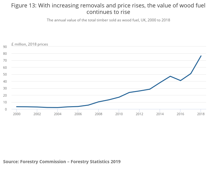 The asset value of UK woodlands was estimated as £129.7 billion in 2017, with timber representing £8.9 billion (6.9%).