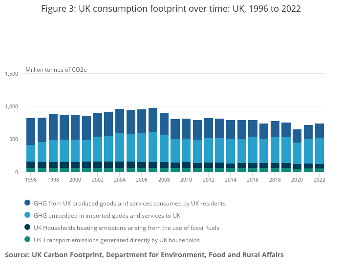 This accounts for all GHG emissions through the supply chain of goods and services consumed in the UK, wherever they are produced in the world. This includes emissions from UK imports of goods and services and excludes emissions arising from UK-produced goods that are exported.