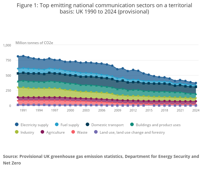 • Territorial emissions cover emissions that occur within the UK's borders and are used to track UK-wide progress towards international and domestic targets, such as net zero emissions by 2050; in 2024, total UK territorial emissions were estimated at 371 million tonnes of carbon dioxide equivalent (Mt CO2e) – a 54% reduction since 1990.
