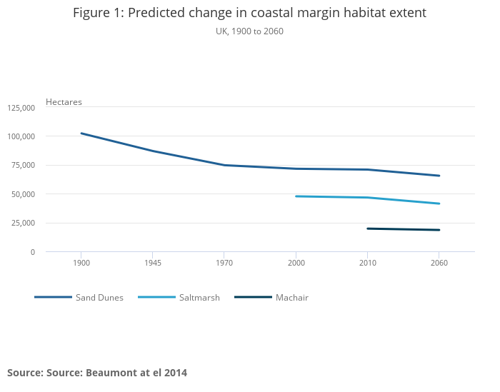 Many coastal margin habitats are amongst the most sensitive to climate change: increased sea level rise can lead to “coastal squeeze” and susceptibility to increased storminess; changing rainfall and temperature will also have adverse impacts.