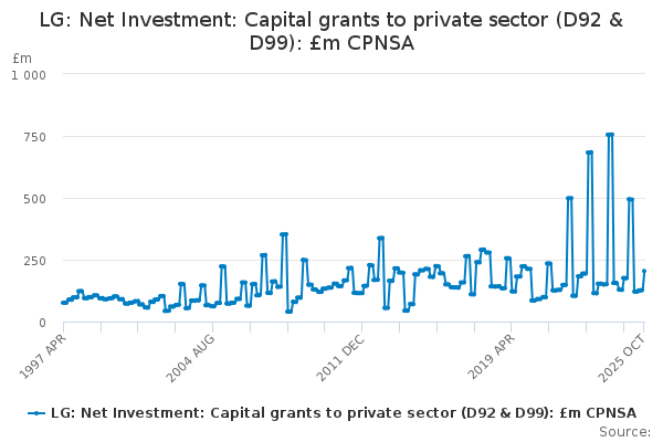 Download this time seriesLG: Net Investment: Capital grants to private sector (D92 & D99): £m CPNSA