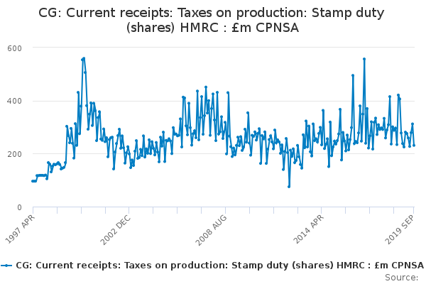 Download this time seriesCG: Current receipts: Taxes on production: Stamp duty (shares) HMRC : £m CPNSA