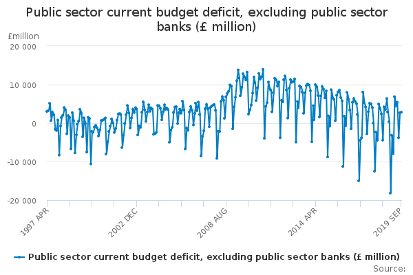 Download this time seriesPublic sector current budget deficit, excluding public sector banks (£ million)