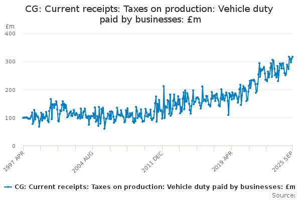 Download this time seriesCG: Current receipts: Taxes on production: Vehicle duty paid by businesses: £m