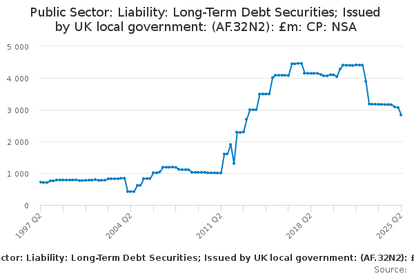 Download this time seriesPublic Sector: Liability: Long-Term Debt Securities; Issued by UK local government: (AF.32N2): £m: CP: NSA