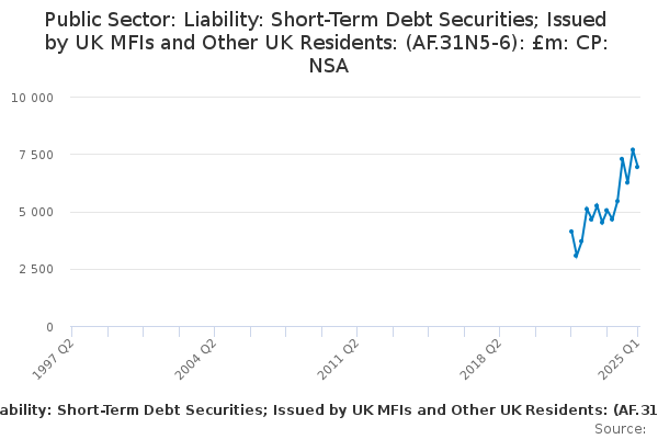 Download this time seriesPublic Sector: Liability: Short-Term Debt Securities; Issued by UK MFIs and Other UK Residents: (AF.31N5-6): £m: CP: NSA