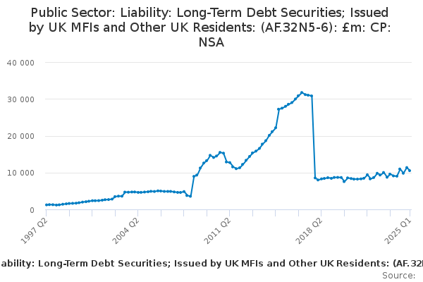 Download this time seriesPublic Sector: Liability: Long-Term Debt Securities; Issued by UK MFIs and Other UK Residents: (AF.32N5-6): £m: CP: NSA