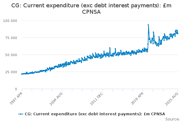 Download this time seriesCG: Current expenditure (exc debt interest payments): £m CPNSA