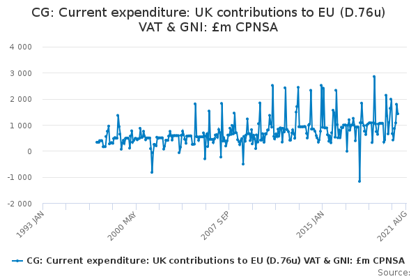 Download this time seriesCG: Current expenditure: UK contributions to EU (D.76u) VAT & GNI: £m CPNSA