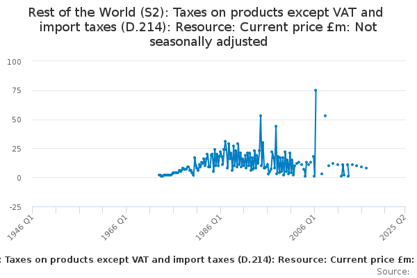 Download this time seriesRest of the World (S2): Taxes on products except VAT and import taxes (D.214): Resource: Current price £m: Not seasonally adjusted