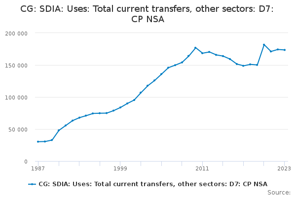 Download this time seriesCG: SDIA: Uses: Total current transfers, other sectors: D7: CP NSA
