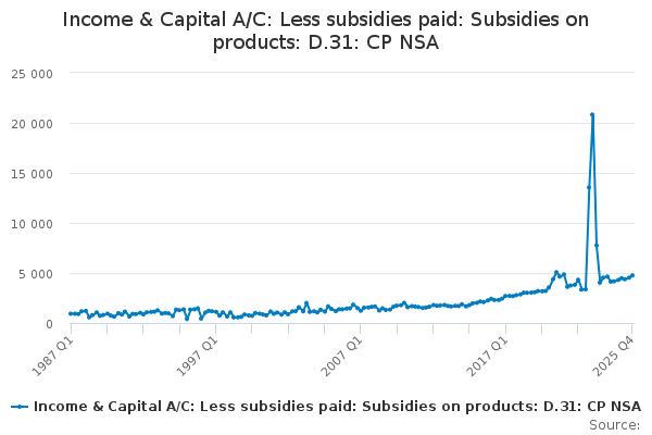 Download this time seriesIncome & Capital A/C: Less subsidies paid: Subsidies on products: D.31: CP NSA