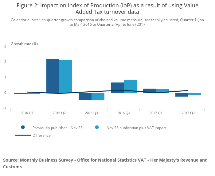 Image .csv .xlsThe introduction of VAT turnover data has had a small impact in revising the Index of Production (IoP) across the time series from Quarter 1 (Jan to Mar) 2016 to Quarter 2 (Apr to June) 2017. This is primarily down to strong positive revisions in the calendar quarter-on-quarter chained volume measure, seasonally adjusted (CVMSA) growth for Quarter 4 (Oct to Dec) 2016 and Quarter 2 (Apr to June) 2017, at 0.15 and 0.13 percentage points respectively. For both Quarter 4 (Oct to Dec) 2016 and Quarter 2 (Apr to June) 2017, this is driven by changes to UK Standard Industrial Classification 2007: SIC 2007 section C – Manufacturing.