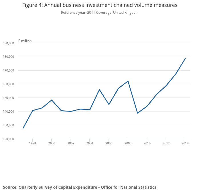 In terms of quarterly estimates, compared with the same quarter of the previous year, business investment has grown for the last 19 quarters (from Q2 2010). In Q4 2014, it was 2.1% higher than the same period in 2013. In Q4 2014, business investment was estimated to be £2.2 billion higher than the pre-downturn peak, Q2 2008. GFCF also grew compared with Q4 2013, by 3.7%.