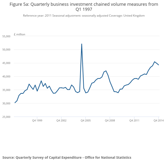 Image .csv .xlsFigure 5a shows a large spike in business investment in Q2 2005. This is due to the transfer of British Nuclear Fuels Ltd (BNFL). In April 2005, nuclear reactors were transferred from BNFL to the Nuclear Decommissioning Authority (NDA). BNFL is classified as a public corporation in National Accounts, while the NDA is a central government body. The business investment series includes investment by public corporations but not government spending, with the positive spike therefore reflecting the £15.6 billion transfer. More information on the transfer of BNFL can be found in the background notes under section ‘3. Further information on methodology’.