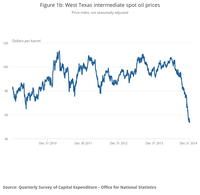 Figure 1a shows the Capex (benched to the Annual Business Survey, ABS) survey estimates for net investment in buildings and other structures by the oil and gas extraction industry, in current prices, not seasonally adjusted. There is a steep fall, of £458 million (22.4%), between Q3 and Q4 2014. Figure 1b shows the Cushing, OK West Texas Intermediate Spot Price Free On Board in dollars per barrel, and a steep fall in the price of oil can also be seen in the last quarter of 2014.
