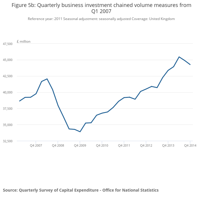 Investment in ICT equipment and other machinery, intellectual property products and dwellings partially offset the fall in the most recent quarter. The growth in investment in ICT equipment and other machinery in Q4 2014 is also reflected in the Confederation of British Industry’s Service Sector Survey where companies reported that they were investing to increase efficiency and upgrade equipment.