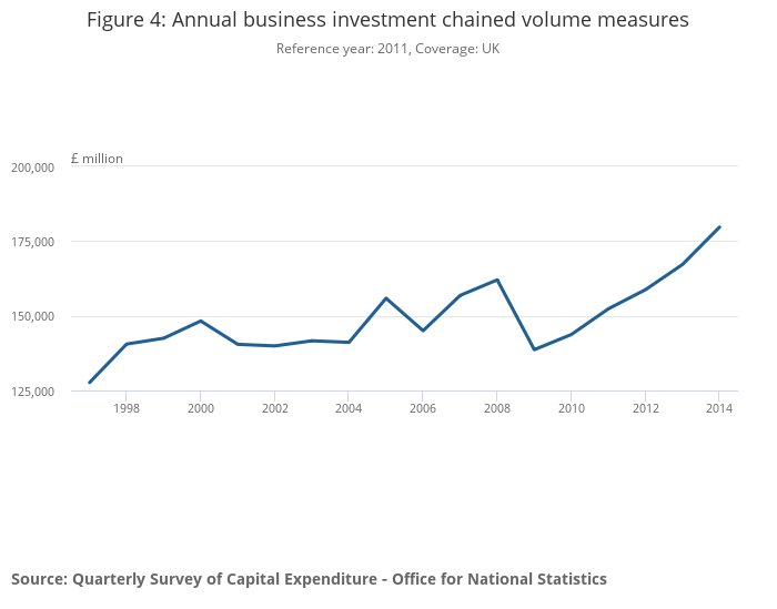 In Quarter 4 (Oct to Dec) 2014, business investment fell by 0.9% to £45.0 billion compared with Quarter 3 (July to Sept) 2014, when it was £45.4 billion. However, the annual level for 2014 is the highest in the published time series. It grew by 7.5% to £179.7 billion.