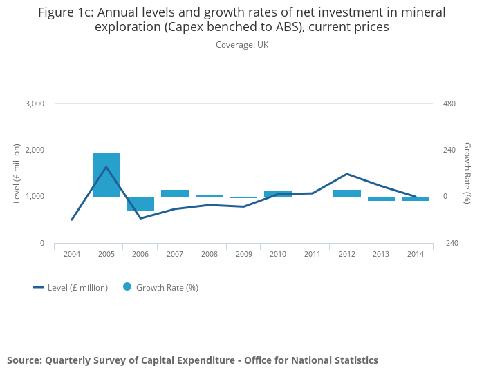 Image .csv .xlsCapex estimates of net investment in mineral exploration in current prices are shown in figure 1c. In 2014, annual net investment in mineral exploration by the extraction of crude petroleum and natural gas industry fell by 18.7% to £1.0 billion; this is the second consecutive annual fall, and the steepest annual fall since 2006. Total net investment for all assets within the same industry fell by 0.3% between 2013 and 2014 to £12.2 billion. In Quarter 4 (Oct to Dec) 2014, total net investment by the industry fell by 7.4% to £3.0 billion (Capex, current prices, not seasonally adjusted).