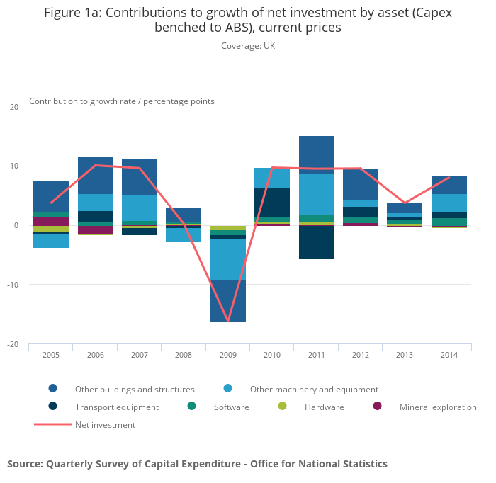 The data used in this analysis, including a full breakdown of net investment by industry sector and asset, can be found at: Net investment by industry sector and asset, from the Quarterly Survey of Capital Expenditure (Capex) estimates, benched to the Annual Business Survey, Quarter 1 (Jan to Mar) 1997 to Quarter 4 (Oct to Dec) 2014.
