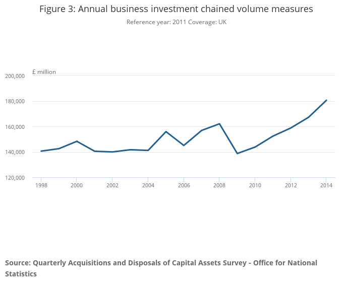 Business investment by industry and asset Detailed breakdown of business investment by industry and asset, in current prices, chained volume measures, non-seasonally adjusted and seasonally adjusted. Annually for 1997 to 2014 and quarterly for Q1 1997 to Q4 2014.