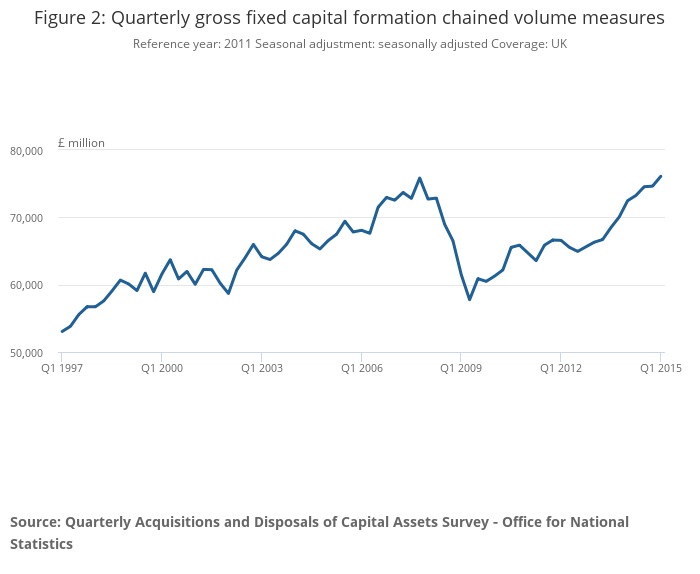 Total gross fixed capital formation increased by an estimated £1.5 billion (2.0%) in Q1 2015 compared with the previous quarter. In Q1 2015, business investment also saw an increase of 2.0%, rising by an estimated £0.9 billion. Private sector dwellings increased by £0.5bn in Q1 2015.