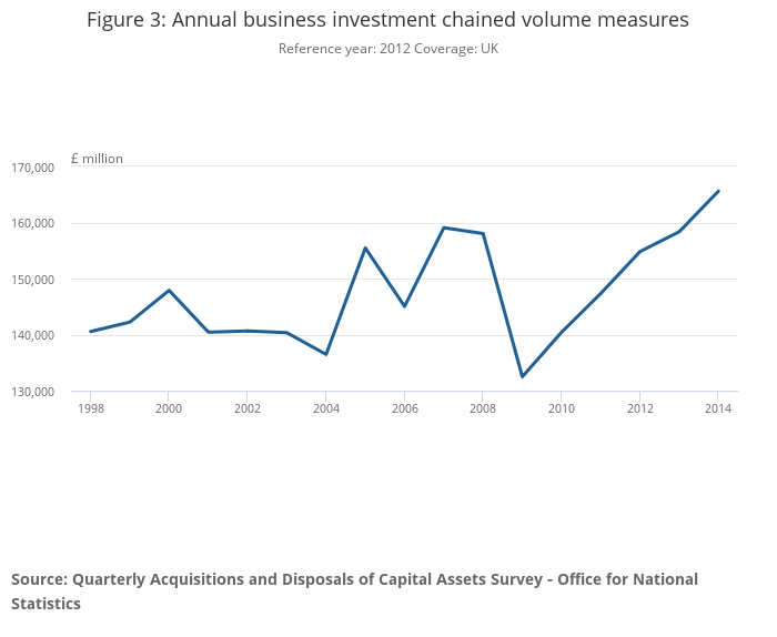 In Quarter 2 (Apr to June) 2015, business investment increased by 3.1% compared with Quarter 2 (Apr to June) 2014
