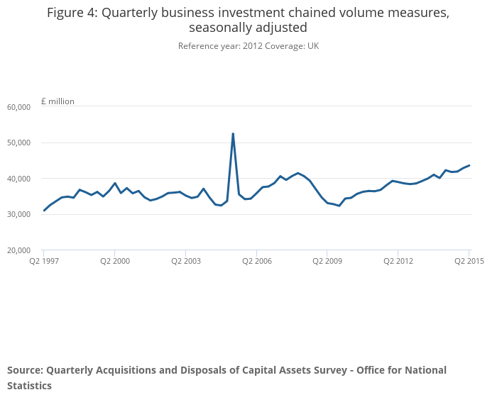 In Quarter 2 (Apr to June) 2015, business investment was estimated to have increased by £0.7 billion (1.6%), compared with the previous quarter, to £43.5 billion