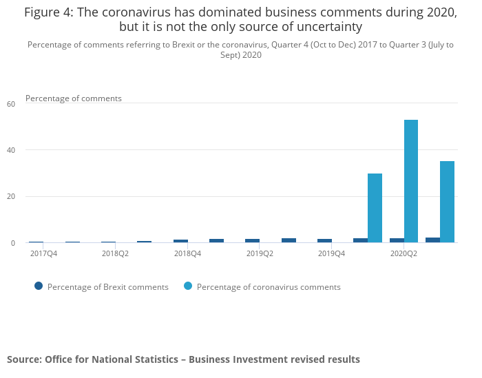 Image .csv .xlsThe coronavirus (COVID-19) has understandably dominated businesses comments during 2020, with around 5,000 individual comments received to date, but this is not the only source of uncertainty. We also isolated comments referring to Brexit. These continued to build during 2018 and 2019 but since then, they have remained steady at around 2% of all comments. With the transition period ending on December 31 2020, we will explore how businesses have reacted to Brexit in their investment decisions in Quarter 4 (Oct to Dec) 2020.