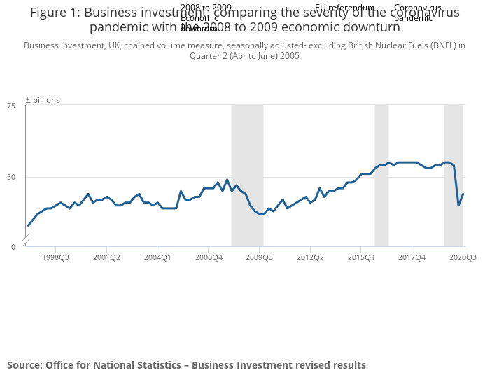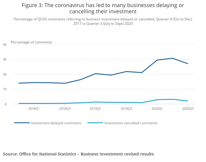 Many businesses stated they rapidly re-prioritised investment decisions to preserve cash flows. As UK-wide lockdowns eased in Quarter 3 (July to Sept) 2020 and businesses reopened, some of that uncertainty fell away but only to a similar extent as the partial recovery in business investment.