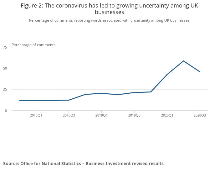 After analysing businesses’ comments for words associated with uncertainty, the relationship between these and the recent business investment profile with its record Quarter 2 (Apr to June) 2020 fall becomes clear. In a completely unknown economic environment, uncertainty and lockdown weighed heavily on business confidence.