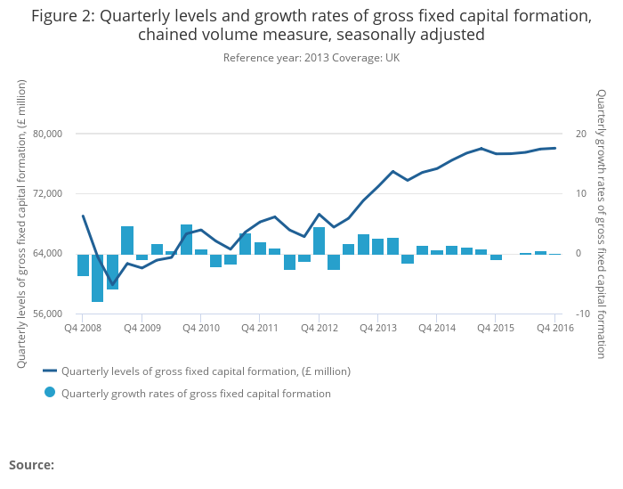 Gross fixed capital formation (GFCF), in volume terms, increased by 0.1% to £78.1 billion in Quarter 4 (Oct to Dec) 2016, when compared with Quarter 3 (July to Sept) 2016 (£77.9 billion).