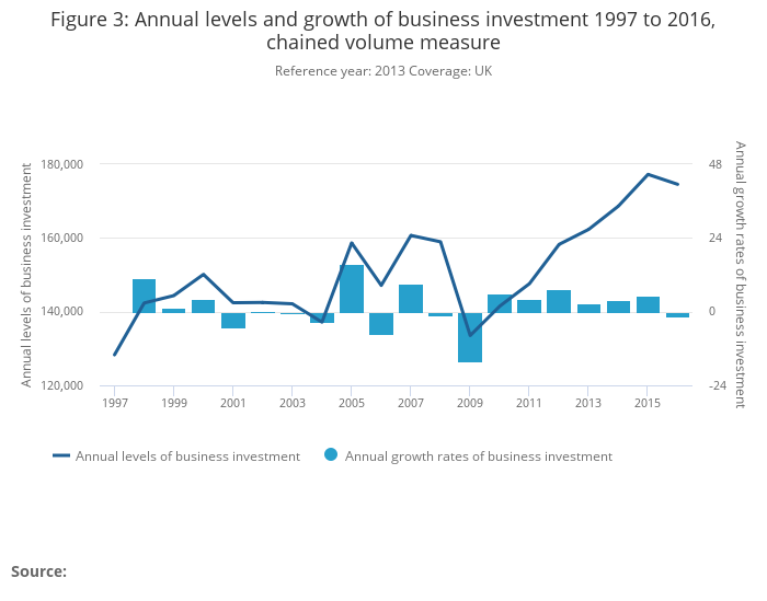 Figure 3: Annual levels and growth of business investment 1997 to 2016, chained volume measure