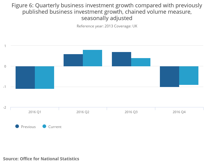 Data in this release have been revised from Quarter 1 (Jan to Mar) 2016 to Quarter 4 (Oct to Dec) 2016 in line with the National Accounts Revisions Policy. A detailed breakdown of past revisions to business investment can be found using the revisions triangles which accompany this release.