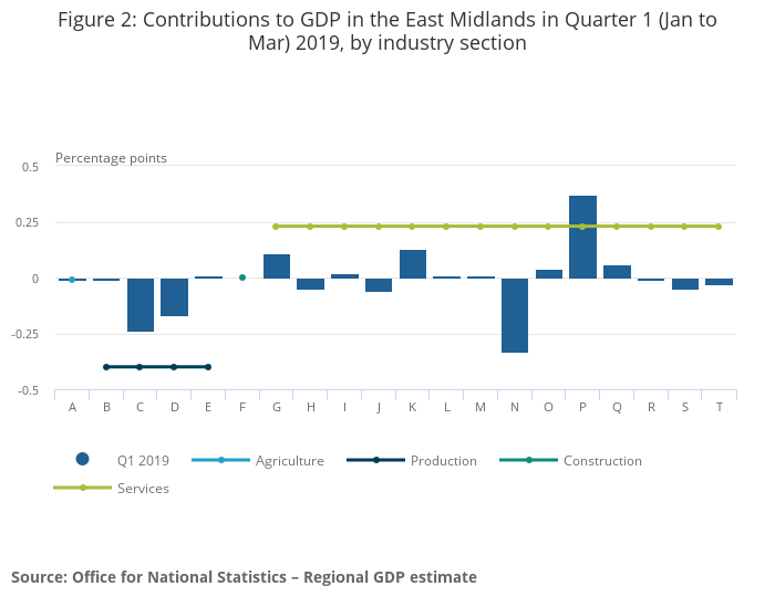 2. GDP growth in the East Midlands was negative 0.2% in Quarter 1 (Jan to Mar) 2019
