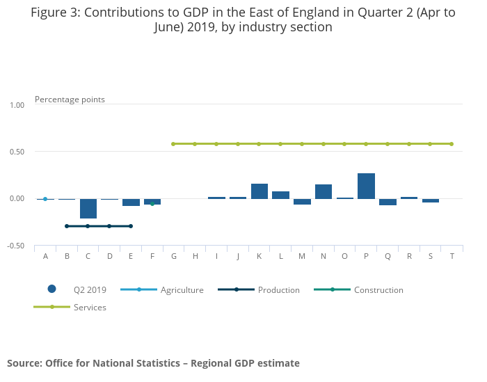 Image .csv .xlsThe education industry grew by 4.8% and made the largest positive contribution to growth in the East of England, at 0.27 percentage points. Meanwhile, manufacturing fell by 1.9% and made the largest negative contribution to growth in the region, at negative 0.21. The services sector was the main contributor to gross domestic product (GDP) growth within the East of England in Quarter 2 (Apr to June) 2019, at 0.58 percentage points.