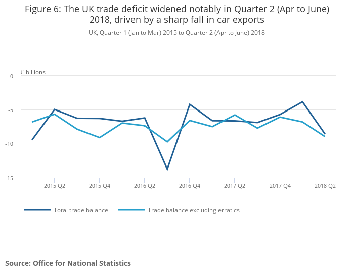 Figure 6: The UK trade deficit widened notably in Quarter 2 (Apr to June) 2018, driven by a sharp fall in car exports