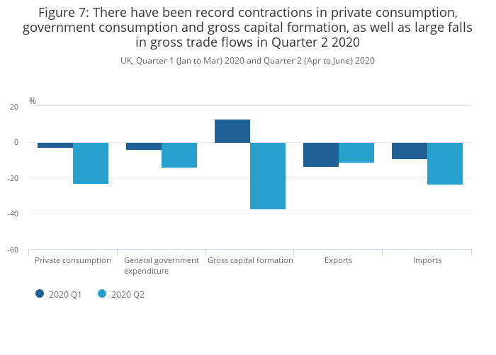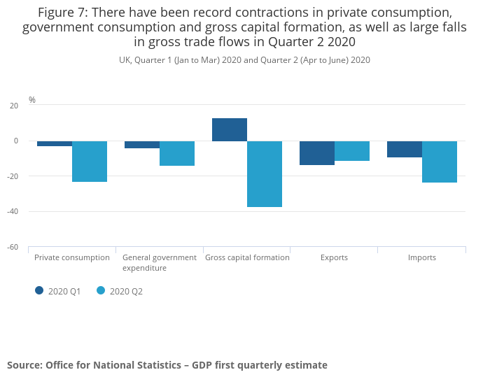 Figure 7: There have been record contractions in private consumption, government consumption and gross capital formation, as well as large falls in gross trade flows in Quarter 2 2020