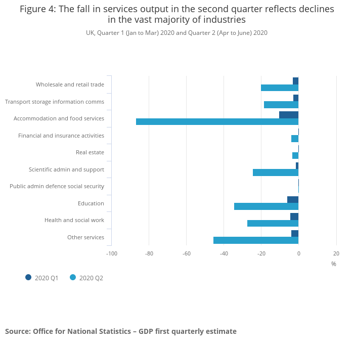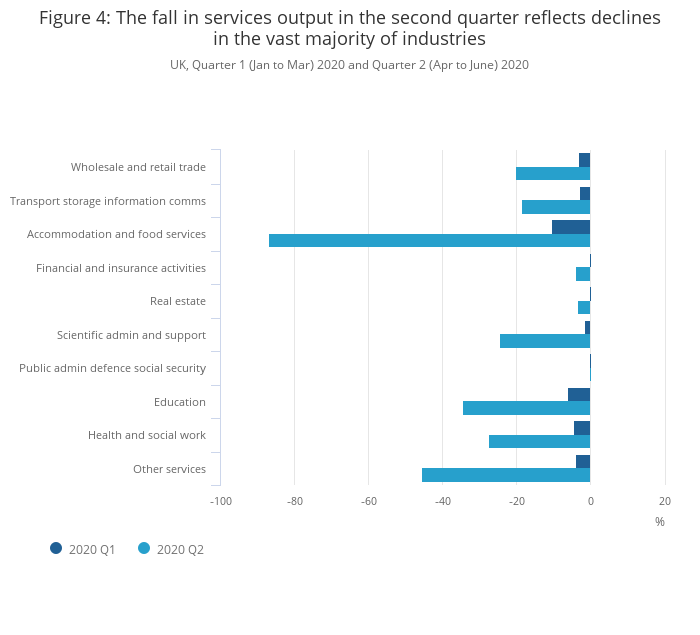There have been record quarterly falls in services, production and construction output in Quarter 2, which have been particularly prevalent in those industries that have been most exposed to government restrictions.