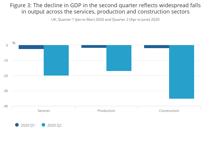 There have been record quarterly falls in services, production and construction output in Quarter 2 (Apr to June) 2020, which have been particularly prevalent in those industries that have been most exposed to the restrictions imposed because of the coronavirus (COVID-19) pandemic. Services output decreased by 19.9% in Quarter 2 2020, while production output fell by 16.9%, and construction output contracted by 35.0% (Figure 3).