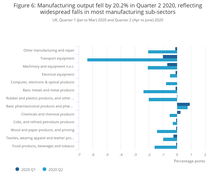 Figure 6: Manufacturing output fell by 20.2% in Quarter 2 2020, reflecting widespread falls in most manufacturing sub-sectors