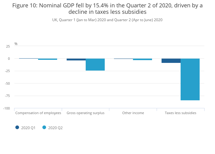 Nominal gross domestic product (GDP) fell by a record 15.4% in Quarter 2 (Apr to June) 2020, following a fall of 1.2% in the previous quarter (Figure 10). Taxes less subsidies fell by 83.7% in Quarter 2 2020, reflecting a decline in tax revenue and an increase in subsidies. The increase in subsidies primarily relates to the Coronavirus Job Retention Scheme (CJRS) and Self Employment Income Support Scheme (SEISS) and incorporate estimates from the updated OBR coronavirus reference scenario (XLS, 3.41MB) published on 14 July 2020. There was also an increase in transport subsidies granted to rail and bus services in the second quarter. Transactions are recorded on an accrual basis within the national accounts, so for reporting purposes the transaction is registered at the point when it was adjudged to take place. There was also a fall in revenue from Value Added Tax (VAT) as well as from fuel, tobacco, stamp, and air passenger duties.