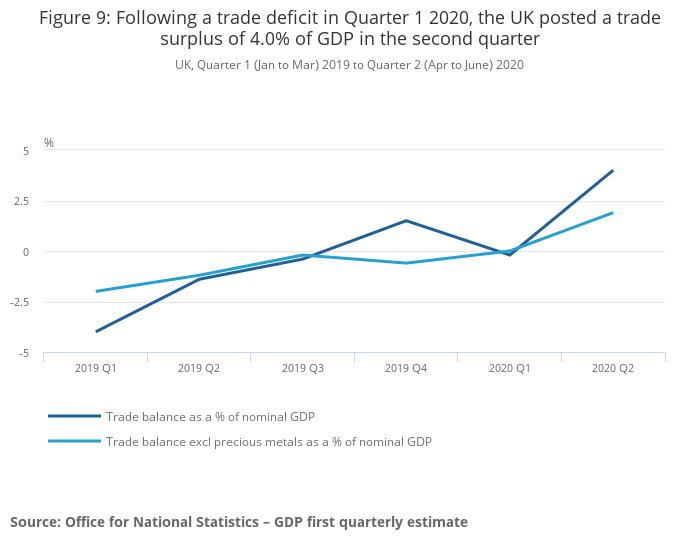 Figure 9: Following a trade deficit in Quarter 1 2020, the UK posted a trade surplus of 4.0% of GDP in the second quarter